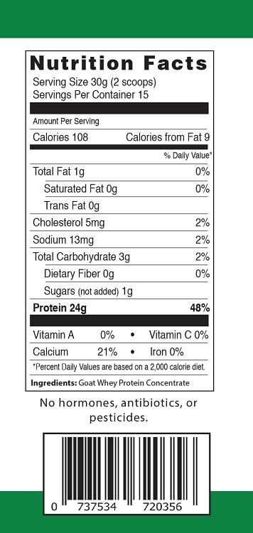 Suggested Usage: Blend 2 scoops (30g) of Grazing Goat Whey Protein™ into 8 oz. of your favorite non-dairy beverage; organic juice or your favorite smoothie recipe.