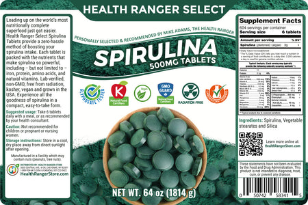 Health Ranger Select Spirulina 500mg Tablets 64oz (1814g) #10 can