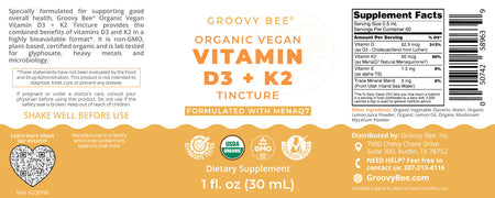 Our Groovy Bee® Organic Vegan Vitamin D3 + K2 Tincture stands out because it uses vitamin D3 sourced from lichen (not lanolin), making it uniquely plant-based and ideal for vegans and those following a plant-based diet. Meanwhile, it is also paired with MenaQ7 (MK-7), the most bioavailable form of K2. We've also included a trace mineral blend sourced from Utah's ancient inland sea water to help enhance nutrient synergy, as well as vitamin E (as alpha-TS) to help stabilize the formula for maximum absorption and shelf life. It also uses vegetable glycerin and purified water to help retain maximum potency.